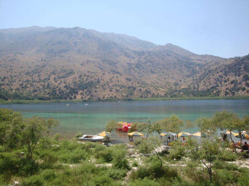 001. Apple-green catamaran on Lake Kournas - (Η λίμνη Κουρνά). This is a unique freshwater lake on Crete Island witch will astonish you with its different hues of water and varieties of flora and fauna. Where else could you find a lake where you could enjoy sweet wild grapes while sailing up to its shore on your catamaran, to see turtles and playing of golden fish? 001. Apple-green catamaran on Lake Kournas