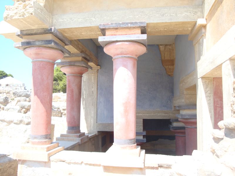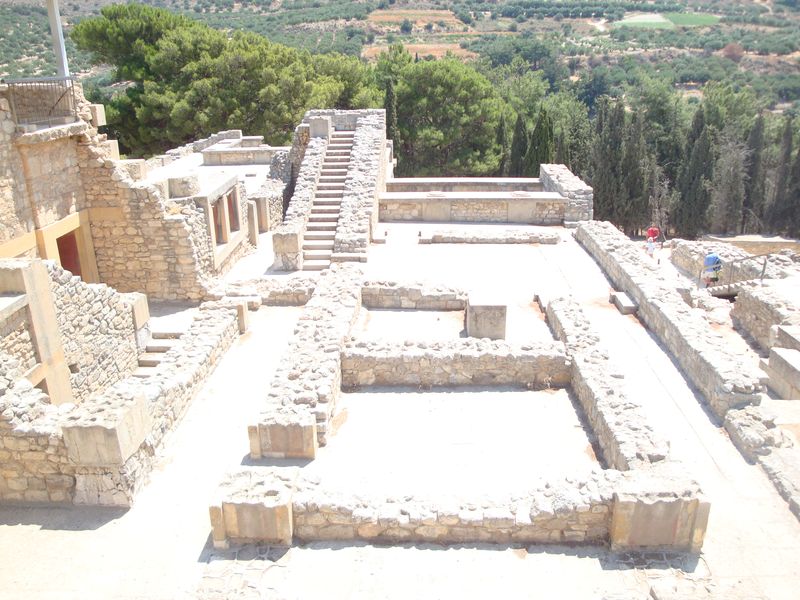 047. View of Knossos ruines - Knossos palace is an impressive construction dated to the golden age of Minoan civilization. The palace relates to the name of King Minos and the labyrinth of Minotaur. Probably, the palace had 3 floors. It is interesting that there were columns that tapered downwards, as well as so-called ‘light wells’ (apertures in the ceiling leading through all the floors of the construction) that were used for ventilation of premises and instead of windows. There was a full-fledged sewerage in Knossos! 047. View of Knossos ruines