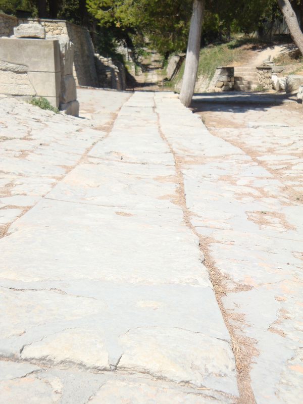 056. Royal road - The road was very well built. It was about 3.8 meters wide and lay on a layer of rough stones that was about half a meter deep, set in a sort of concrete made of clay with the addition of potsherds and small pebbles. This road leads to the Theatre Area. Knossos (Κνωσσός) 056. Royal road