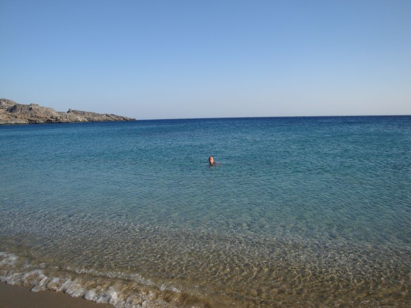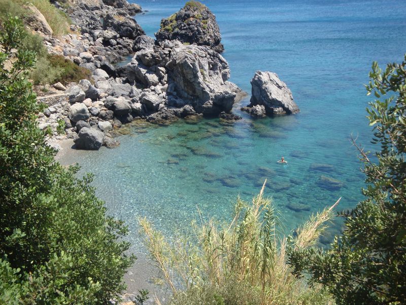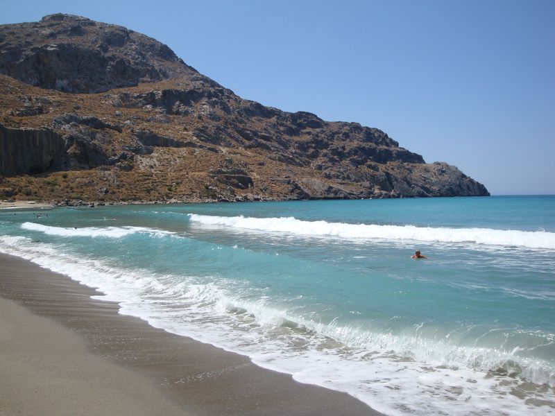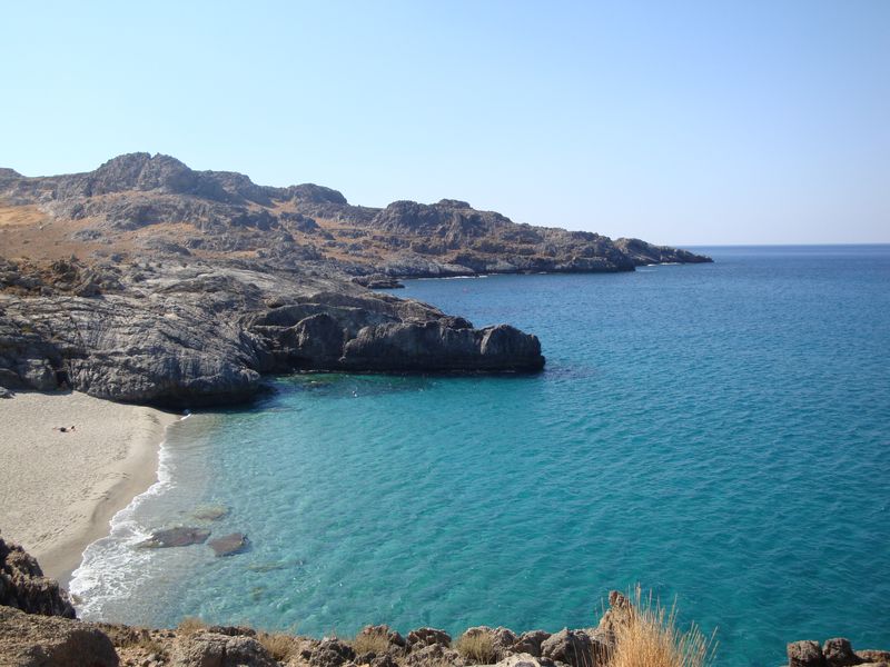 002. South Crete, Damnoni and Plakias beaches - On the left there is Damnoni beach (η παραλία Δαμνόνι), on the right there is Plakias beach (η παραλία Πλακιάς), Rethymno (Ρέθυμνο). South Crete is wayward, wild and beautiful! There are long belts of clean and empty beaches. Not many people. Silence, beauty, and calmness! The climate is drier and therefore it is better than in the north of Crete. There is no stifling and soggy heat here so it is easier to endure July hot. The place works fine for families with children. The Libyan sea is almost invariably calm, without waves, but the water is a bit colder (can’t say like ‘newly drawn milk’) because of the mountain rivers emptying themselves into the sea. You should remember that there is much less entertainment here than in the North Crete. It is quite difficult and takes a long while to get somewhere from South Crete by car or bus because of its serpentine roads. 002. South Crete, Damnoni and Plakias beaches