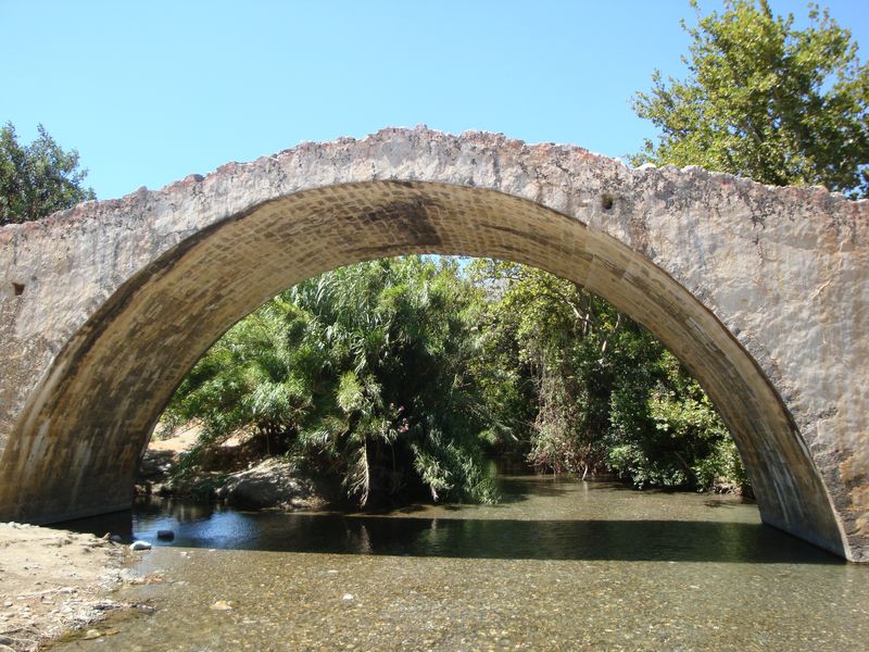 052. Venetian bridge - Bridge over the Megalos Potamos river (Ο Μεγάλος Ποταμός) upstream. There is snack-tavern nearby by the bridge ‘Η Γέφυρα.’ Geese, blue dragonflies and pink flowers are found at the river. You can wander for some time along the river and even dip into the cold water like locals. 052. Venetian bridge