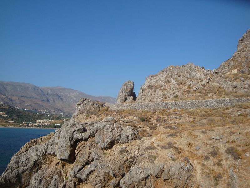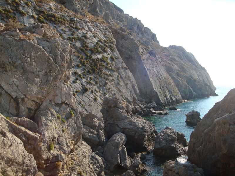 067. Cutaway rocks - Once coal was mined here. There is a path on the top along the wall and futher. The view of all Plakias bay is opening up from here. Here and there the path goes right over a cliff! The left edge of Plakias (Πλακιάς), South Crete. 067. Cutaway rocks