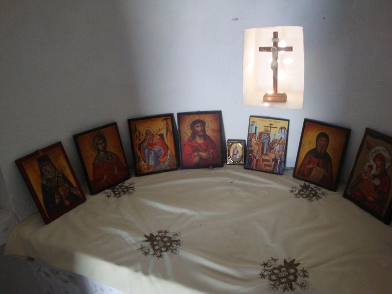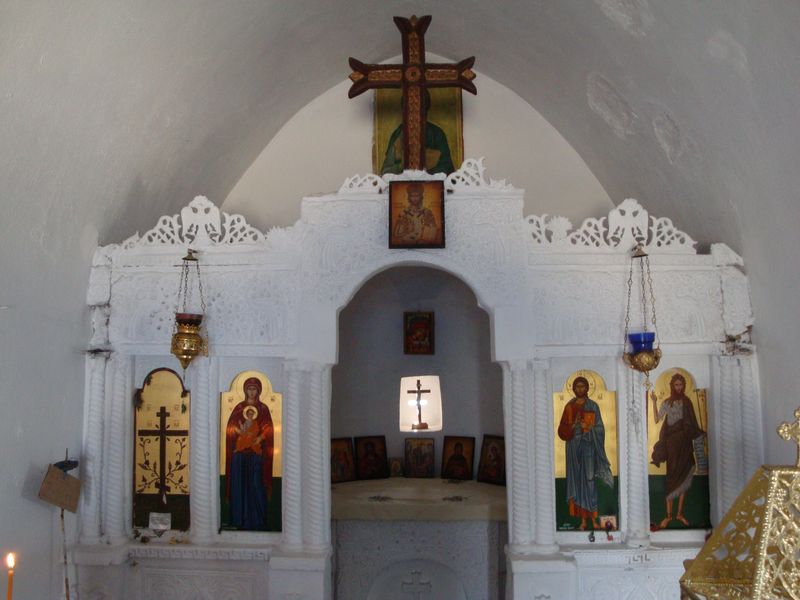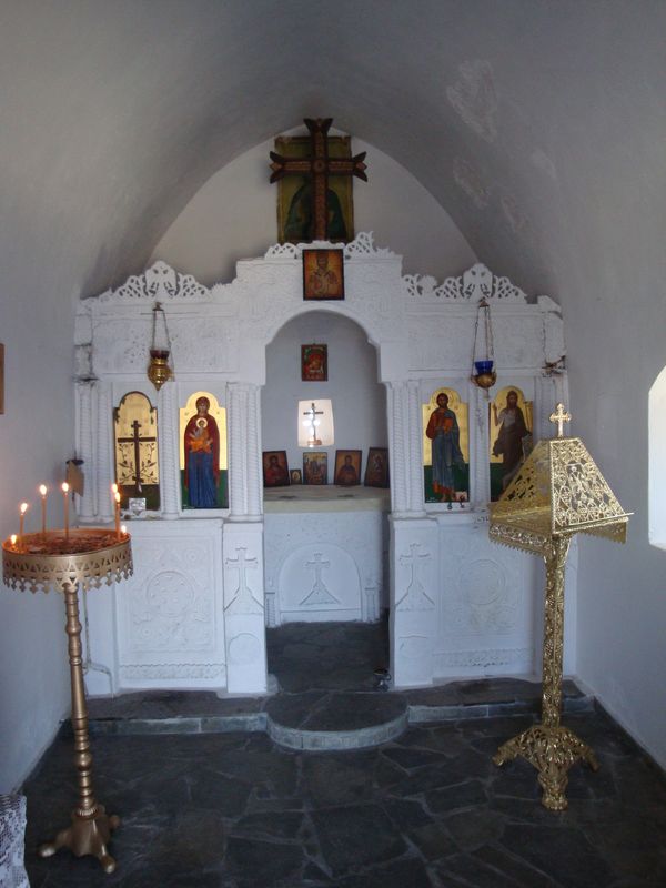 079. Timios Stavros church - There is a very nice isolated church with beautiful and powerful icons. Climbing with children complicated by strong wind occupied 1 hour and 10 minutes. When climbing it is better to wear trousers and it’s better to do it in more or less breathless weather. We had to bend down or almost lie down on the ground during strong blasts of wind not to be gone with that wind. The road is bad and it turns into a scree at the end of the height of 420 meters above the sea. We literally walked in the footsteps of mountain goats. The church is open every day. You should blow out candles when leaving the church. Skinaria village (Σκινάρια, Ρέθυμνο), South Crete. 079. Timios Stavros church