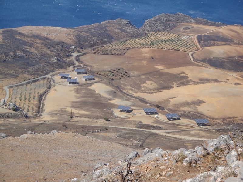 086. Top view - You can see solar panels in the bottom of the photo. Timios Stavros Church (Τίμιος Σταυρός). Skinaria village (Σκινάρια, Ρέθυμνο), South Crete. 086. Top view