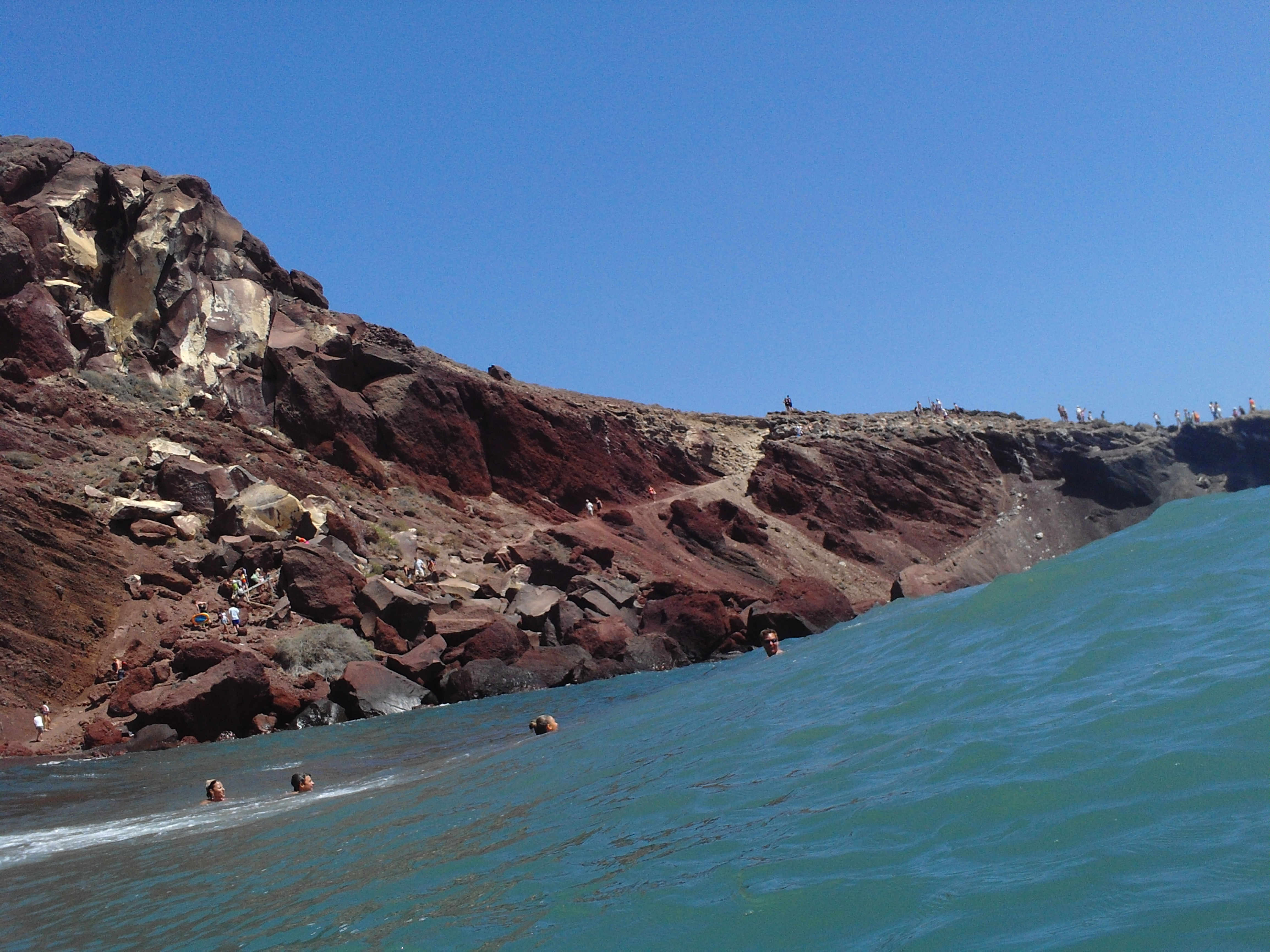 Having left our suitcases in the hotel, first of all we went to swim at the Red Beach. There were big waves and the brown beach sand was mixing with the seaweeds. A narrow road comes down to the sea, so you need to make your way through the boulders.