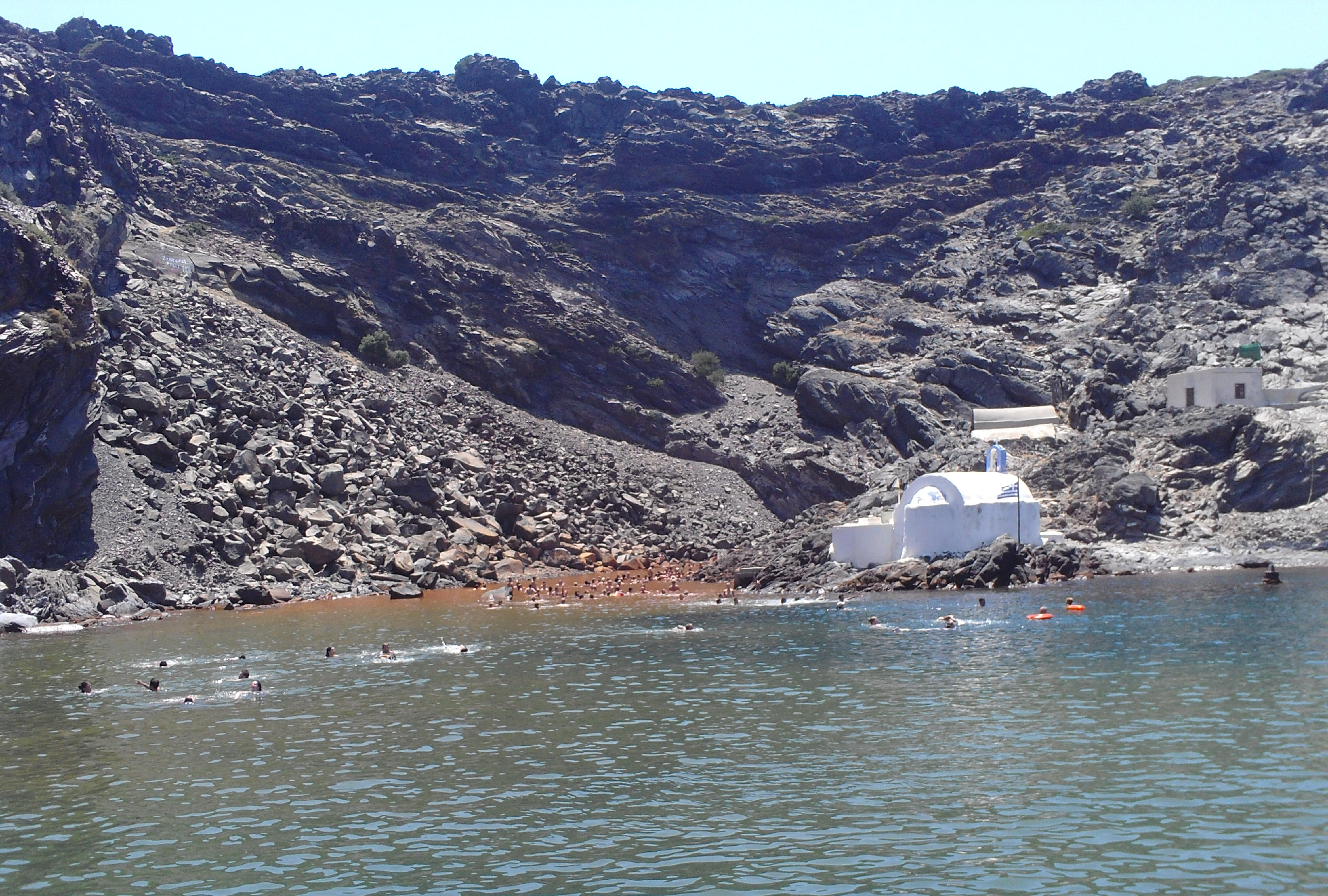 After the bathing in the warm orange waters of the sulfur springs, we enjoyed the swimming in the cool blue waters of Therasia Island (Θηρασία).