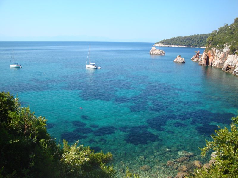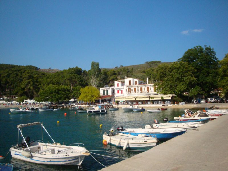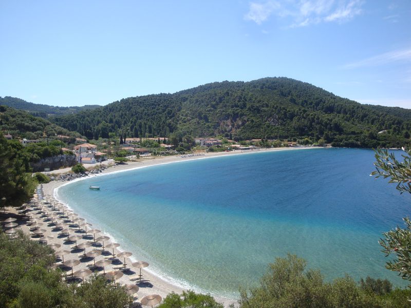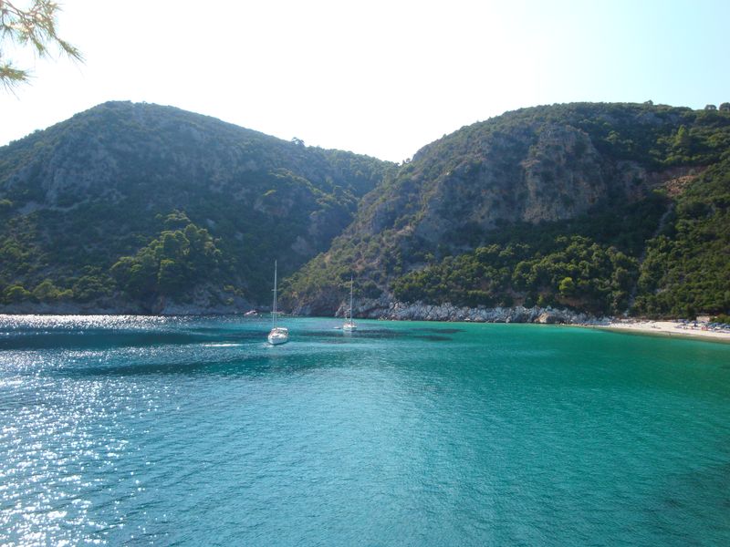 The church from the film Mamma Mia comes to mind, of course, we visited it... Just beside it is a beautiful desert beach and the church of Agia Panagia (Αγία Παναγία) a little further up the road. I also recall the beach at Stafylos (Στάφυλος), in particular the rightmost bay, which I swam across several times and lay for a long time on my back in a little cave, listening to the quiet murmuring of the water.