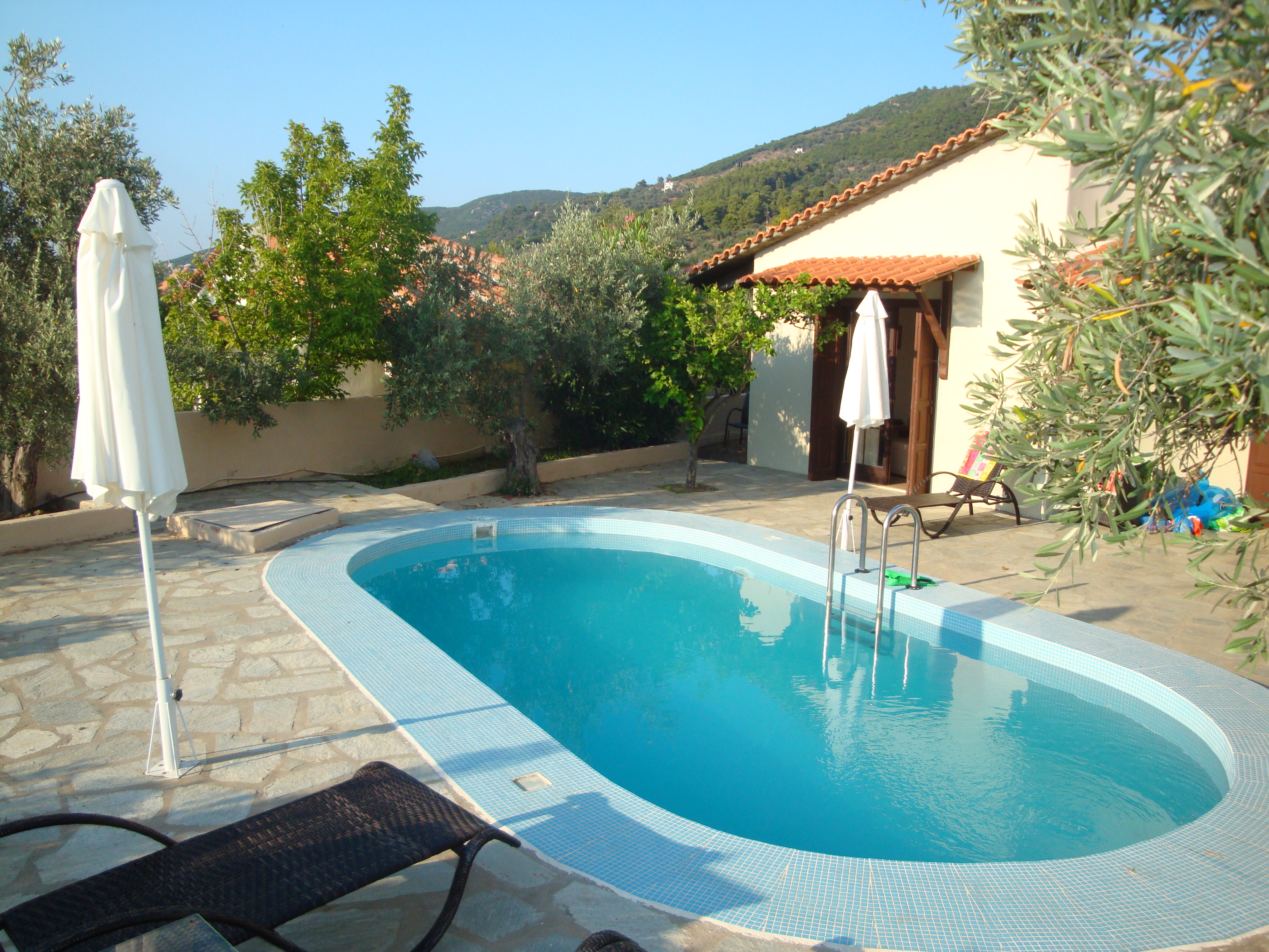 At the end of the holiday we moved into a bungalow with a private swimming pool for several days. You sit yourself down on the verandah in the evening by the pool, pour yourself a glass of Greek wine under an olive tree, and admire the starry sky above the town at night – we were amazed to see an ordinary hardware store on the hill shining almost like the Parthenon! No economy at all, as the strict Germans would say, but what beauty, we thought!