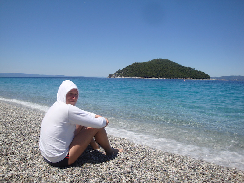 The church from the film Mamma Mia comes to mind, of course, we visited it... Just beside it is a beautiful desert beach and the church of Agia Panagia (Αγία Παναγία) a little further up the road. I also recall the beach at Stafylos (Στάφυλος), in particular the rightmost bay, which I swam across several times and lay for a long time on my back in a little cave, listening to the quiet murmuring of the water.