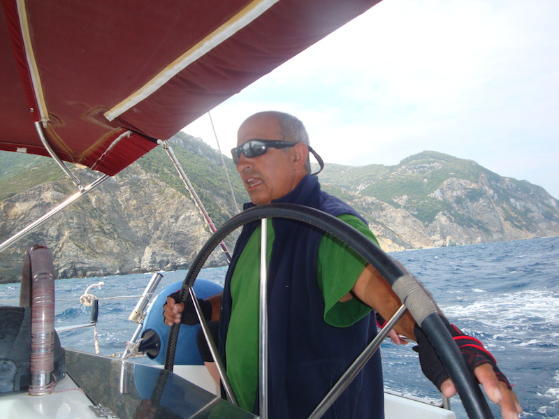 We sailed out to sea in search of dolphins with Captain Vasilis on a yacht, this was our first experience and our first full-on storm. The yacht was tossed from side to side, and we were obliged to wedge our feet against the projections on the deck and convulsively grab onto the handrails (several of us were immediately out of action with seasickness). Everybody took turns to steer in the stormy conditions and came through this baptism of fire, but the award for courage and seamanship went to my middle son. Vasilis was a seasoned captain, as nimble and agile as a crab, managing to do everything.